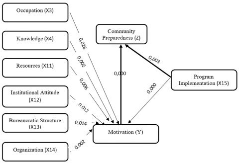 In sum, these findings confirm that motivation (Y) is a dominant mediator that translates structural, social, and individual factors into preparedness behavior. Effective interventions must prioritize strengthening motivation through enhanced program implementation, active community organizations, bureaucratic reforms, and institutional responsiveness—identified here as the most influential pathways to improved disaster preparedness [65].