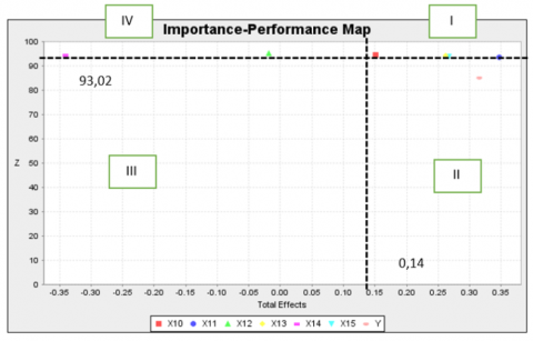 In research using PLS-SEM, it is recommended to conduct further analysis to provide clear managerial implications regarding management priorities and attention. One method used is the Importance Performance Map Analysis (IPMA), which combines two dimensions, namely the level of importance of variables or indicators (importance) and their actual performance (performance) against the dependent variable or target construct in the model. With this approach, IPMA helps identify variables or indicators that are considered important by respondents and evaluate their performance, so that management can make data-based decisions and avoid erroneous assumptions. The IPMA process integrates descriptive analysis in the form of average performance values and inferential analysis in the form of total effects, which are then plotted in a quadrant map based on the X axis (importance/total effect) and the Y axis (performance/satisfaction). This mapping makes it easier to group variables or indicators into categories that need to be maintained or improved. IPMA results are presented in two forms, namely the construct level and the more detailed indicator level, providing comprehensive strategic guidance for management [66].
