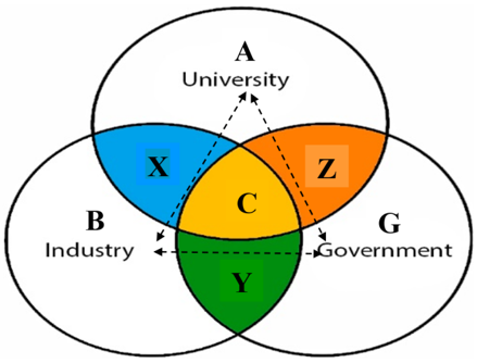 According to the mixed model convergent with collaborative action from institution perspective, this method can be understood in the form of a triple helix collaboration as represented in Figure 1. Part A is the quality of the academic/university institution shown by the research team. Meanwhile, part B is the quality of the analyzed business/industry and entrepreneurship institution. Part G is the quality of related government institution with policy regulations. Part C is the central point of the new collaborative strength in the new integration model as the final value of the expected institution quality. This shows that part C is an area of collaboration and investigation serving as the best basic choice for making recommendations or regulations for institution quality change policies. Therefore, action research is necessary for understanding various situations and conditions of socio-cultural behavior patterns to provide added value for better and more adaptive positive social innovation changes.