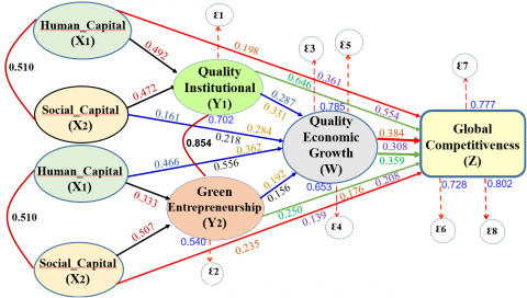 Results and discussion to explain the objectives are presented in tables and diagrams based on the structural equation model test. This research refers to the main problem and the objectives proposed to be analyzed in detail. Based on Table 1, the main variables of human capital (HC) and social capital (SC) provide a significant positive contribution to institution quality and green entrepreneurship. In terms of determinants, HC and SC factors provide good and strong contributions to promoting institution quality and green entrepreneurship, respectively. Based on Tables 1, 2, and 3, these results are consistent with previous research stating that HC is the main key to driving quality economic growth directly and indirectly. Meanwhile, SC is stronger as a driver of global competitive resilience [28]. The role of SC tends to promote innovation in green entrepreneurship as decisions of the new socio-economic institution and SSE is selected based on consequences.