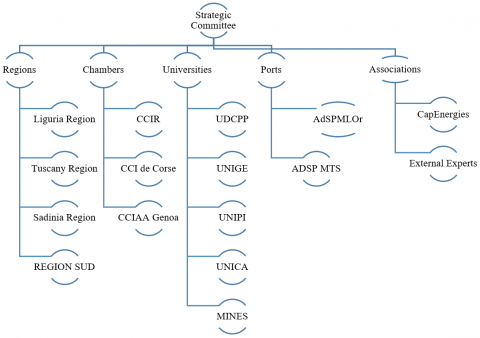 The strategic cooperation committee (see Figure 2) is formed to guide H2 development in the cooperation area. Based on the quintuple helix model, the committee will provide strategic oversight, coherence, impact evaluation, and coordination. Members will include academic partners, local authorities, chambers of commerce, H2 associations (e.g., France Hydrogène, H2IT), and port authorities.