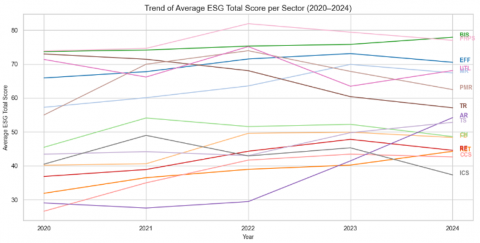 -Descriptive analysis of ESG trends by sector -Visualization: line charts, boxplots |