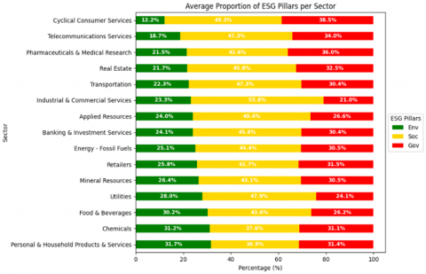 -Descriptive analysis of ESG pillars and subcategories -Sectoral comparison -Visualization: stacked bar charts |