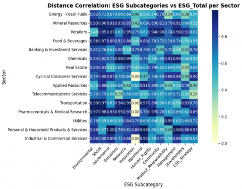 The sectoral mapping of ESG performance underscores that effective ESG strategies must move beyond disclosure quantity and instead emphasize the thematic relevance and impact of each subcomponent. The observed mismatch between subcategory disclosure levels and their actual correlation with ESG Total scores highlights the need to assess not only what is reported, but how much it contributes to sustainability performance.