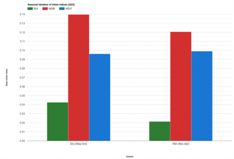 The LST measurements, derived from the Landsat-8 thermal band with an inherent uncertainty of ± 2.5℃, showed mean values of 32.8℃ with spatial variations ranging from 28.5℃ to 39.2℃ across the district. This thermal range, captured during morning overpasses (10:45 am), likely underestimates peak afternoon temperatures by 3–5℃ based on typical diurnal cycles in tropical urban environments.