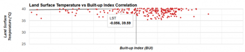 Correlation analysis was conducted between Sentinel-2 (10 m) morphological indicators and Landsat-8 (30 m) land surface temperature using 500 stratified random sample points, with spatial aggregation ensuring scale compatibility. The correlation coefficients reveal unexpectedly weak relationships that challenge the assumptions of conventional urban heat islands, with all thermal correlations falling below the significance threshold after Bonferroni correction (adjusted α = 0.008). The correlation coefficient between BUI and LST was only 0.1292 (p > 0.008), indicating a minimal linear association between BUI and SST, which is substantially lower than the typical values of 0.6-0.8 reported in contemporary urban areas.