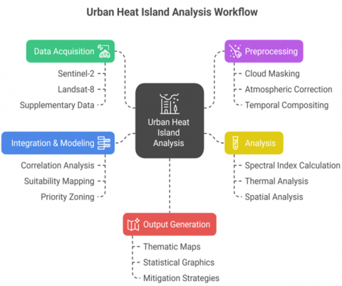 Figure 3 shows the methodological workflow of data acquisition, processing, analysis, and output generation phases. The methodology follows an organized workflow that begins with satellite data acquisition and preprocessing and proceeds through multiple analytical phases to achieve actionable spatial planning recommendations. The initial procedures involved cloud-based filtering of optical imagery using quality assessment bands to ensure minimal atmospheric interference, radiometric calibration and atmospheric correction to derive surface reflectance values, and geometric clipping to study area boundaries. The integration of multi-resolution datasets through resampling and co-registration techniques enables synergistic analysis of detailed morphological patterns and thermal characteristics. The analysis then transitions toward integrated assessment phases, in which spectral indices converge with temperature measurements to identify intervention opportunities through suitability mapping algorithms focusing on green infrastructure potential and feasibility of cool surface implementation. This systematic analytical process culminates in the development of spatially explicit mitigation strategies using quantifiable thermal reduction projections and priority zone mapping, establishing direct operational links between satellite-derived environmental indicators and practical implementation of sustainable cooling interventions for heritage district planning.