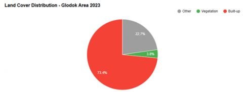 Figure 4 shows the distribution of land cover in research area. Spatial distribution analysis reveals distinctive morphological patterns that illuminate both development pressures and preservation opportunities within the complex urban fabric of the district. The mean value of the normalized difference built-up index was 0.1449, with a standard deviation of 0.1027, indicating that the intensity was moderate but variable across the study area. The 70.86% coefficient of variation for NDBI, which is substantially lower than the BUI’s 453.96%, suggests more consistent patterns in built-up detection than the composite built-up index. The range from -0.3967 to 0.5154 for NDBI encompasses both water bodies (negative values) and highly developed areas (positive values), confirming the heterogeneous land cover within the 2-kilometer radius study area centered at coordinates -6.1449°S, 106.8149°E.