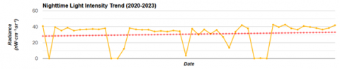 Figure 8 shows the nighttime light trends based on VIIRS day/night band monthly composites. The high spatial variability revealed through COV analysis provides critical insights for targeted intervention strategies. The extreme BUI variation (CV = 453.96%) indicates highly localized development patterns, suggesting that blanket policies would be inappropriate for this heterogeneous landscape. Site-specific interventions tailored to local morphological conditions offer greater potential for effective thermal management. Areas with negative BUI values (-1.1755 minimum) represent existing water bodies or exceptional vegetation patches that should be preserved as thermal refuges. Conversely, the maximum BUI zones (0.5744) identify priority areas for cooling interventions where the built environment modification could yield substantial benefits.