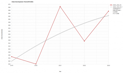 Figure 9 shows the urban area expansion trend from multi-temporal analysis of Sentinel-2 imagery (2019-2023). The strategic recommendations emerging from the integrated analysis must account for the weak morphology-temperature relationships while leveraging high spatial variability for targeted interventions. Short-term priorities should focus on preserving existing thermal assets, particularly the vegetation patches reaching 0.7908 NDVI, which represent critical cooling resources within the district. Protection of these areas through immediate designation as conservation zones could prevent further thermal degradation while maintaining baseline ecosystem services. Medium-term initiatives should address the limited vegetation-cooling relationship through strategic green infrastructure that creates connected networks rather than isolated patches, potentially strengthening the currently weak NDVI-LST correlation through threshold effects. Long-term transformation requires addressing anthropogenic heat sources through traffic management, building energy efficiency improvements, and district cooling systems that complement morphological interventions.