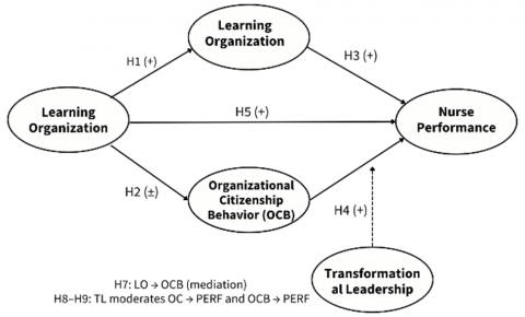 Within hospitals, organizational learning has been linked to stronger employee commitment, clearer vision and goals, and closer alignment with service expectations [9, 13]. A learning culture is also associated with higher organizational commitment and job satisfaction, which can translate into better work outcomes [14]. Affective, continuance, and normative commitment provide different reasons for staying and investing effort, and these motives can be particularly salient in public or quasi-public settings where employment is shaped by budget constraints and formal performance evaluation [15]. At the unit level, nursing leadership influences structural empowerment and self-efficacy, which affects whether nurses can maintain professional practice behaviors under pressure [16]. Taken together, these arguments suggest that the effect of organizational learning on nurse performance may operate through organizational commitment and Organizational Citizenship Behavior (OCB), and that the strength of these relationships may depend on transformational leadership.