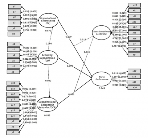 | 1 | Effect of Organizational Learning on Nurse Performance | 0.463 | 0.394 | 4.991 | 3.783 | 0 | Accepted |