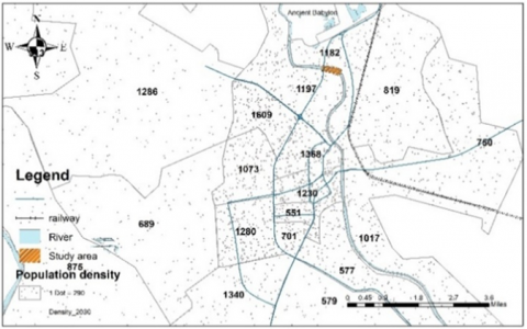 The space is surrounded by a wall made of iron railings to protect its occupants, with some entrances and exits to and from the premises. The site is rectangular in shape, 600 meters long and 120 meters wide (including the river), with a total area of 72,000 square meters stretching from the Bith Bridge to the Blue Bridge. The southern river bank is marked by its direct link to the city center, which is bustling with activity and home to the majority of inhabitants' favorite attractions, particularly the Babylon Tourist Hotel. The northern bank is distinguished by tranquility and solitude. The location of the study area is shown in Figure 2.