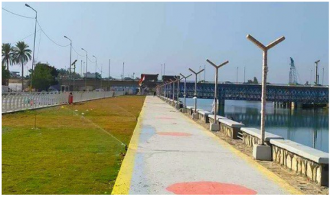 Major urban development began in 2021 when the Ministry of Water Resources designed and launched the Hillah Corniche development project, which involved reshaping and enhancing the area’s features. This project included urban upgrades to surrounding neighbourhoods and improvements in transportation by constructing a second road axis parallel to the Bith Bridge. Initial work in the study area was carried out as a pilot model within the first year and then extended along the river. In 2023, a pedestrian bridge—known as the Blue Space Bridge—was added, becoming a significant landmark and a point of attraction for local residents. Additionally, a boat marina was introduced during 2024–2025 to promote river transportation and recreational activities, as illustrated in Figure 4.
