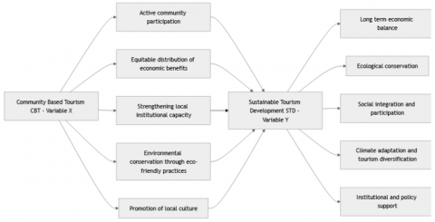 The constructs of CBT and STD were translated into dimensions and measurable indicators to guide data collection and analysis. CBT (X) was operationalized into five dimensions: active community participation, equitable economic distribution, institutional strengthening, ecological conservation practices, and promotion of local culture. STD (Y) was defined through five dimensions: long-term economic balance, ecological conservation, social integration, climate adaptation, and institutional-policy support. Table 1 summarizes the operational variables.