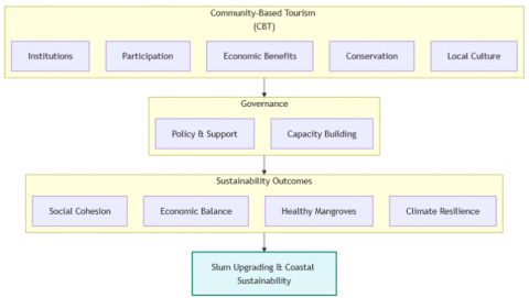 This model (Figure 5) synthesizes the quantitative results into a systemic representation of how local tourism practices interact with broader governance frameworks to foster sustainability. At the foundation, five dimensions of CBT—community participation, equitable economic distribution, institutional strengthening, environmental conservation, and cultural promotion—act as primary drivers of change. These drivers interface with governance mechanisms such as adaptive institutional design, pro-climate economic incentives, integrated conservation–cultural programs, and inclusive capacity building. The interaction between CBT and governance shapes five sustainability outcomes: economic balance, ecological conservation, social cohesion, climate resilience, and policy support, all of which converge in the broader goals of slum upgrading and sustainable coastal development.