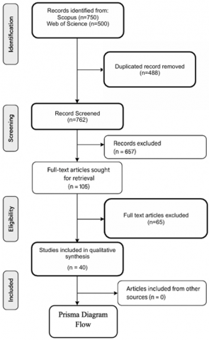 The initial search yielded a total of 1,250 records across both databases (Figure 1). During the identification stage, several exclusion criteria (Table 1) were applied. First, duplicate records were removed. Following this filtering process, 762 unique records proceeded to the screening phase. Based on a review of titles and abstracts, 657 articles were excluded due to a lack of relevance to the research topic. The remaining 105 full-text articles were successfully retrieved for further evaluation. Quality appraisal of all full-text articles was conducted using the Mixed Methods Appraisal Tool (MMAT 2018) to ensure methodological rigor. Two independent reviewers assessed each study, and only articles scoring ≥60% were retained for synthesis. Any discrepancies were resolved through discussion, resulting in a substantial inter-rater reliability (Cohen’s kappa = 0.81). Following this appraisal process, 40 high-quality studies were included in the final review. No supplementary records were identified through other sources during the process.