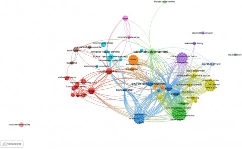 Larger nodes such as sustainability, ESG, and HRM signify high-frequency keywords, while the proximity and link strength among nodes demonstrate their semantic interrelation across the literature. This visualization underscores the multidisciplinary nature of ESG-HRM integration and highlights the central role of stakeholder-driven governance and sustainability leadership in shaping MSME strategies. These insights align with recent studies emphasizing the strategic value of green HRM and ESG alignment in driving competitive and ethical performance in small enterprises.
