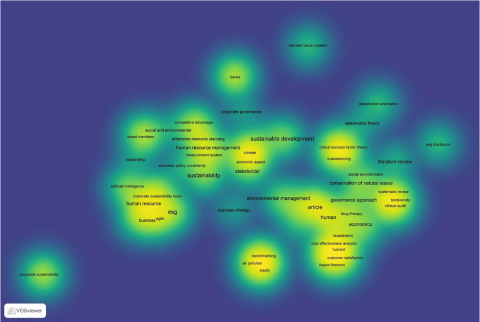 Moreover, the heatmap shows that ESG research in the MSME context is closely linked to broader themes such as corporate governance, economic aspect, and conservation of natural resources. The clustering of keywords like investment, customer satisfaction, equity, and air pollution near the economic and governance themes indicates an interdisciplinary integration of environmental and economic performance indicators. Meanwhile, the presence of artificial intelligence and high performance sustainable work systems in the outer, less dense areas suggests these are emerging concepts with growing scholarly interest. This visualization complements the co-occurrence network by emphasizing the hotspots of academic focus, reaffirming the growing integration of HRM strategies within ESG frameworks for MSMEs. As such, this heatmap aids in identifying both the core knowledge areas and underexplored themes within the field, offering valuable direction for future research on sustainable enterprise transformation.