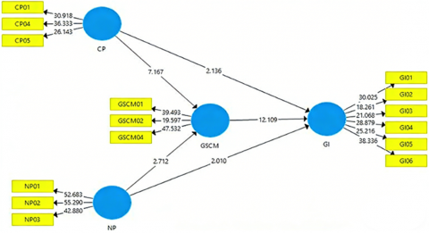 The study confirms that GSCM significantly promotes green innovation, supporting H1. By integrating green practices across procurement, production, and distribution, companies enhance process, material, and technological innovations [6, 31-33]. In the palm oil sector, this is reflected in the use of eco-friendly inputs, conversion of Palm Oil Mill Effluent (POME) into biogas, and optimized distribution reinforcing green innovation [1]. Consistent with institutional theory, organizations adopt these practices to respond to external environmental expectations [4], and in Indonesia, export market demands and sustainability standards further encourage the implementation of GSCM.