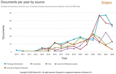 Tribology International emerged as the most influential journal with the highest number of publications and citations. This is understandable, as tribology (the science of friction, wear, and lubrication) is a core field that underpins the development of biolubricants. This journal plays a crucial role in disseminating knowledge and encouraging the adoption of vegetable and insect oils as alternatives to mineral oils. The distribution of the highest number of publications and citations based on biolubricant knowledge by source per year can be seen in Figure 8.