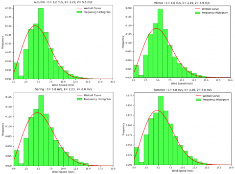 From the measured data, we calculated the Weibull parameters and the average annual and seasonal hourly speed, which allow us to plot the Weibull curves and frequency histograms (Figures 5 and 6).
