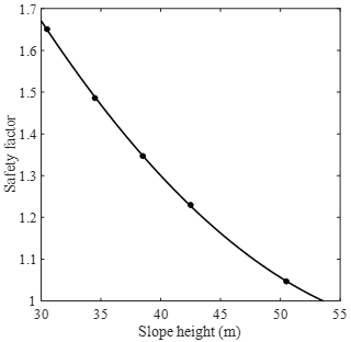 The influence of slope height on safety factor was analyzed by changing the slope height, while fixing all the other factors. The analysis results are shown in Figure 1 and Table 3. It can be seen that the safety factor decreased exponentially with the growing slope height.