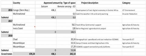But the second analysis on data covering the 2015 - 2018 period, revealed significantly increased numbers and figures for these space related projects, making them more than an “initiation”. and justifying a more detailed study. In general the index still reveals too weak a propension to deal with space. The approved amount of such projects, concentrated in TLC and EO services, therefore does not seem to match its big potential role; the total figure of WB and AfDB together, considering the final year (2018) as a reference, is in fact worth for Africa 335,6 Million (M) \$. Although this is a record value, resulting from a continuous yearly increase, it still accounts for only 0.6% of this global “all-sectors” ODA, that is ca. 60 Bn\$,