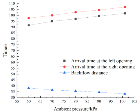 Table 2 shows the time of arrival of smoke at the left and right openings of the tunnel under different ambient pressures, and the backflow distance of the smoke to the upstream within 75s. The data in the table were plotted as shown in Figure 4.