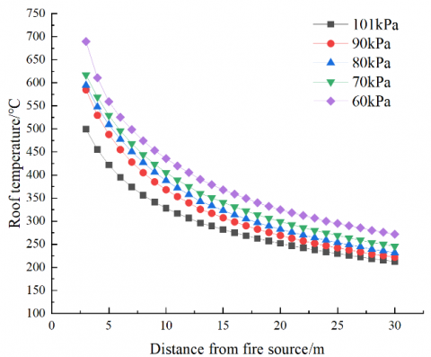It can be seen from Figure 5, when the fire source size remained the same, the roof temperature was relatively high in the low-pressure environment at the same distance. With the rise of ambient temperature, the smoke temperature on the roof gradually fell; The temperature under the roof gradually reduced with the growing distance from the fire source, and eventually tended to be stable.