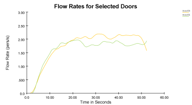 The flow rate through the hypothetical exits was nearly identical in all cases. But there was a quick discharge and quick escape, up to the first 15 seconds, as indicated by the steep curve. This seems obvious in the case where there is just one hypothetical emergency exit. The flow rate stabilized after it oscillated about one person per second through exits with one unit of exit width and two people per second through exits with two units of exit width. This is the regular rate designed for exits with these exit widths.