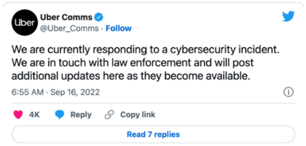 Another recent incident that impacted a lot is the massive breach suffered by Uber. The popular ride-hailing company Uber has faced an enormous data breach in which the company fell victim to a general Phishing scam where the attacker fantasized about being someone associated with the company. They then persuaded an employee with many login credentials to get access to the company’s internal systems. The company then lost their respect and reputation across the whole world. Thus, one phishing attack can cause great loss. This issue happened on 15 September 2022 and became a massive phishing attack. On 15 September 2022, Uber’s internal systems were completely compromised. The attacker figured out how to hack the organization’s hacker one account, then accessed a Leeway account which gave access to the AWS web administrations and even the GCP accounts. Hence, Uber is still investigating the incident; most internal systems were temporarily disabled due to the hack/ phishing attack. On 15 September 2022, an 18-year-old learned to hack Uber through phishing. He (the hacker) had a small blueprint of the organization’s inward frameworks and initiated some social strategies to compromise a worker’s account. After earning the account credentials, he gained access to the company’s internal databases and obtained full control over the company’s Amazon Web Services and even the Google Cloud Accounts. An official tweet circulated during the incident is shown in Figure 2.