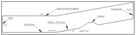 The Fifth Order solitary waves are generated at the left and propagate towards the right, where the inlet boundary is selected with open channel flow parameters (Choosing shallow wave in Wave BC Option, and Average Flow Direction in reference wave). The bottom and stepped structure are treated as a stationary wall and no-slip condition, to assure no further inputs are required and the wall is not moving relative to the adjacent cell zone, while the top is considered a pressure outlet, where backflow direction specification method is normal to boundary (see Figure 2(a)).