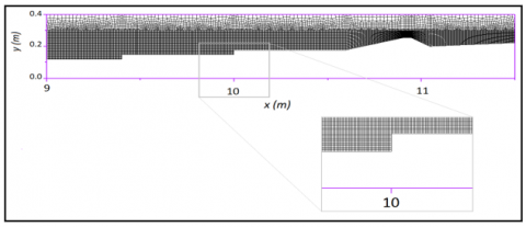 The geometric model and grids are generated using ANSYS ICEM, In the vertical direction, the grid size start from 3 mm it was kept constant all the way at y=0.3 m and to y=0.3 to up to the top of the domain the grid size dy=10 mm. In the stream-wise direction the mesh is reduced gradually, from the inlet of the domain to x=6 m the grid size is dx=10 mm-dy=3 mm, from x=6 m to x=8 m the grid size is dx=5 mm-dy=3 mm, and from x=8 m at a location 1m downstream of seawall, the size is dx=2 mm-dy=2 mm to capture the shoaling and breaking of solitary waves, finally the grid size increased dx=10 mm-dy=10 mm from x=12 m at the end of the domain.