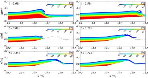 The preceding comparison effectively demonstrates the concordance between numerical results and free surface measures obtained from various gauges, and a qualitative comparison with laboratory images. The next comparisons are further made with the free surface and wave pressure field (Figure 6).