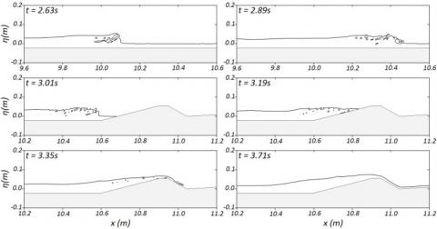 The solitary wave is generated and shoaled as it advances along the slope. Due to the significant nonlinearity of the incident solitary waves (A/h=0.35), the wave finally broke on the slope, resulting in the formation of a plunging breaker at t=2.63s, illustrated on Figure 5(a).