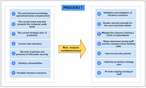 (G) Process 7. Conduct risk analysis. In this process, the analysis team determines the activities the organization must follow to identify the highest priority risks that are threats to the organization (see Table 3). To accomplish objectives, the threats must be defined by the team using the knowledge obtained from the information collected, like the exposed assets, threats and their impact on the organization, current security practices and the lack of those, as well as determine the probability that the risk can materialize by creating criteria to evaluate the risk and conduct a multidimensional risk analysis (Figure 6). The purpose of this process is to make a list according to the criteria to evaluate the risk and two aspects: the impact and probability.