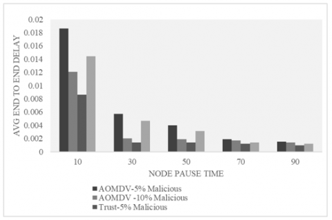 Figure 1 clearly indicates that the introduced trust model exhibited noteworthy enhancements in packet delivery ratio when subjected to scenarios involving malicious nodes. Specifically, the proposed trust model demonstrated a remarkable 20.02% enhancement in packet delivery ratio compared to the AOMDV protocol under the influence of 5% malicious nodes, with a node pause time of 30 seconds. Moreover, when confronted with 10% malicious nodes and a node pause time of 50 seconds, the proposed trust model showcased a substantial 19.96% improvement in packet delivery ratio compared to the AOMDV protocol. Figure 2 shows the delay analysis.