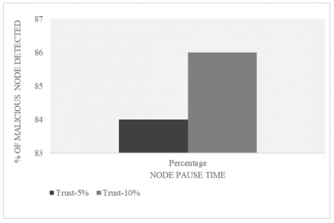 It can be observed from the Figure 4 that the proposed trust model with 10% of malicious nodes improved the percentage of malicious nodes detected by 2.35% than trust model with 5% of malicious nodes.