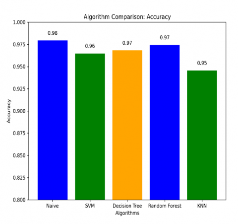 We have compared our dataset with other algorithms, namely SVM, Decision Tree, Random Forest, and KNN, and observed that Naïve Bayes performs exceptionally well, as shown in Figure 4. The Precision, Recall, and F1-Score of Naïve Bayes for Ham SMS were 98%, 99%, and 99%, respectively (Table 3). Similarly, for Spam SMS, the Precision, Recall, F1-Score, and Accuracy of Naïve Bayes were 99%, 85%, and 92%. The accuracy of the algorithm was found to be 98%, which was the highest among all.