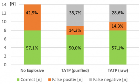 The results of the dog searches (Office without explosive, TATP raw, TATP purified) are shown in Figure 2 below. The figure summarizes the results of the two searches per type (No Explosive/TATP (purified)/TATP (raw)). "Correct" means that the team reported the correct location of the hidden explosive or, in the case of scenarios without explosives, that in a room without explosive the team correctly did not indicate a “find”. "False positive" means the supposed discovery of TATP although there was none at this location, while "false negative" means that the hidden explosive was not found by the team.