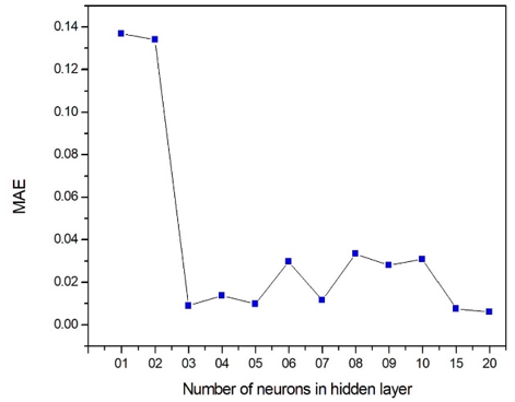 To enhance the performance of the neural network, the number of neurons in the hidden layer was adjusted to optimize R2 values and minimize MSE values. The study found that the R2 and MSE values varied independently of the number of neurons used, until 10 neurons were utilized. However, when 15 and 20 neurons were incorporated in the hidden layer, they yielded the same R2 value of 0.966. The correlation coefficient, which gauges the degree of correlation between two variables that are measured continuously, is a useful tool for evaluating the strength of the relationship between the two variables [23]. To eliminate the possibility of random weight initialization by the software, each topology was replicated 10 times, and the mean MSE was calculated. The network's performance in terms of MSE and MAE was graphed against the number of nodes in the hidden layer, as depicted in Figures 5 and 6. It was observed that the network's error rate decreased and stabilized when the number of nodes in the hidden layer reached 10. Consequently, 10 neurons were utilized in the hidden layer for further development of the network.