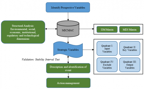 MICMAC Analysis (Matrice d'Impacts Croisés Multiplication Appliquée à un Classement) is a method used to identify and analyze the relationships between variables within a complex system [25]. MICMAC is a tool frequently employed in strategic planning, particularly to understand the dynamics among interrelated factors within a system [26]. This method allows researchers to map out key variables and determine how these variables influence one another. MICMAC begins with defining the problem so that both internal and external research variables can be identified.