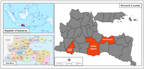 This research was conducted in three key coastal locations in East Java: Malang 2024, Trenggalek, and Probolinggo (Figure 2). These areas were selected due to their distinct coastal ecosystem characteristics and significant agribusiness potential. Each research location has different social, economic, and environmental conditions, which are expected to provide a comprehensive understanding of the variables that influence the success of agribusiness in the coastal regions of East Java.