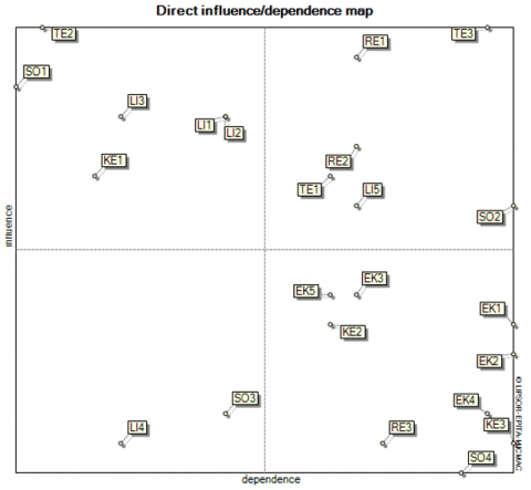 The analysis results presented in Figure 3 indicate that TE2 (Availability of marine fisheries technology infrastructure), SO1 (Level of community participation in resource management), LI3 (Marine biodiversity), KE1 (Local government involvement in resource management), LI1 (Sea water quality), and LI2 (Coastal ecosystem condition) are variables that act as driving factors as they fall within Quadrant I (variable input). These variables influence all prospective variables in agribusiness success in East Java's coastal areas, especially in the context of sustainability and food security.