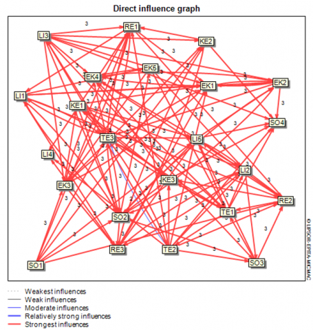 Please use the SI set of units as much as possible. Wherever Figure 4 illustrates that in the direct influence graph, key variables such as RE1, TE3, RE2, TE1, LI5, and SO2 play a central role, affecting and being affected by many other variables due to the numerous connecting lines valued at 3. This direct dependency among these variables highlights the complexity of relationships within the agribusiness and sustainability system in East Java's coastal areas. A comparative analysis with similar studies, such as those by Ramenzoni [38] and Khan et al. [39], suggests that the availability and enforcement of sustainable fishing laws (RE1) are critical in regulating the sustainable use of marine resources. Studies in other coastal areas, like those conducted in Thailand [40], similarly highlight that strengthening law enforcement in sustainable fishing significantly impacts not only regulatory compliance but also encourages the adoption of innovative practices in resource management.