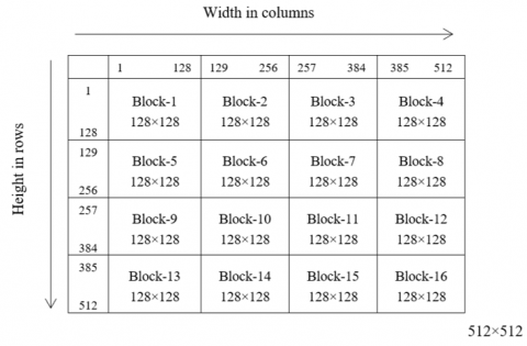 The normalized image NormI is segmented into 4×4 blocks (refer to Figure 2), each block comprising 128×128 pixels.