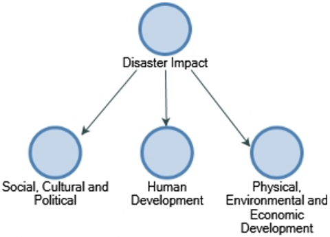 The disaster impact scheme is divided into three main categories: social, cultural, and political development, human development, and physical, environmental, and economic development. This illustrates that natural disasters do not only affect one aspect of life but also spread to various dimensions of human life and the environment [15].