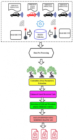 VANETs, gated sway networks, advanced encryption schemes, centrality feature extraction, NIST, sybil attack detection, wormhole attack detection