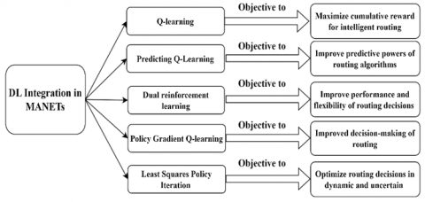 The innovative integration of DL strategies with MANET routing paradigms altogether upgrades the approach to tending to the challenges inborn to network's instability and inefficiency. This integration, especially through the application of Q-learning alongside LAR, constitutes an all-encompassing strategy pointed at moving forward the operational efficiency of MANETs. Q learning, a model-free reinforcement learning (based on DL) calculation, specializes in learning the esteem of activities inside particular states, permitting for the optimization of ways through the aggregation of encounters from both effective and unsuccessful bundle conveyances. This viewpoint of Q-learning is especially useful inside the unstable situations of MANETs, where conventional steering calculations frequently increment steering overhead and bundle misfortune due to their inadequacy to review past ways. Alternately, Q-learning outfits the directing prepare with the capacity to distinguish and support reliable routes with more prominent proactivity and adaptability. This refined approach not as it were diminishing pointless network activity but too, through its integration with the versatile learning capabilities of Q-learning, guarantees the directing handle is not just constrained to a foreordained region but is additionally capable at advancing based on chronicled information. This juncture of Q-learning and LAR not as it were capitalizing on the qualities of both strategies but too specifically impacts key KPIs such as directing proficiency, packet delivery success rate, and organize activity overhead. By intrinsically connecting these KPIs with DL parameters just like the reward function, activity esteem gauges, and the learning rate of Q-learning, this advanced routing procedure underscores a significant jump forward within the improvement of more effective, versatile directing conventions for MANETs, subsequently encouraging a wide range of applications from crisis reaction to strategic military operations, where the network's capacity for fast adjustment is critical. A more streamlined process for route finding and maintenance is achieved as a result of the algorithm's ability to predict and avoid likely routing faults. To improve the Q-learning and LAR hybrid, more study should be done in the following areas: